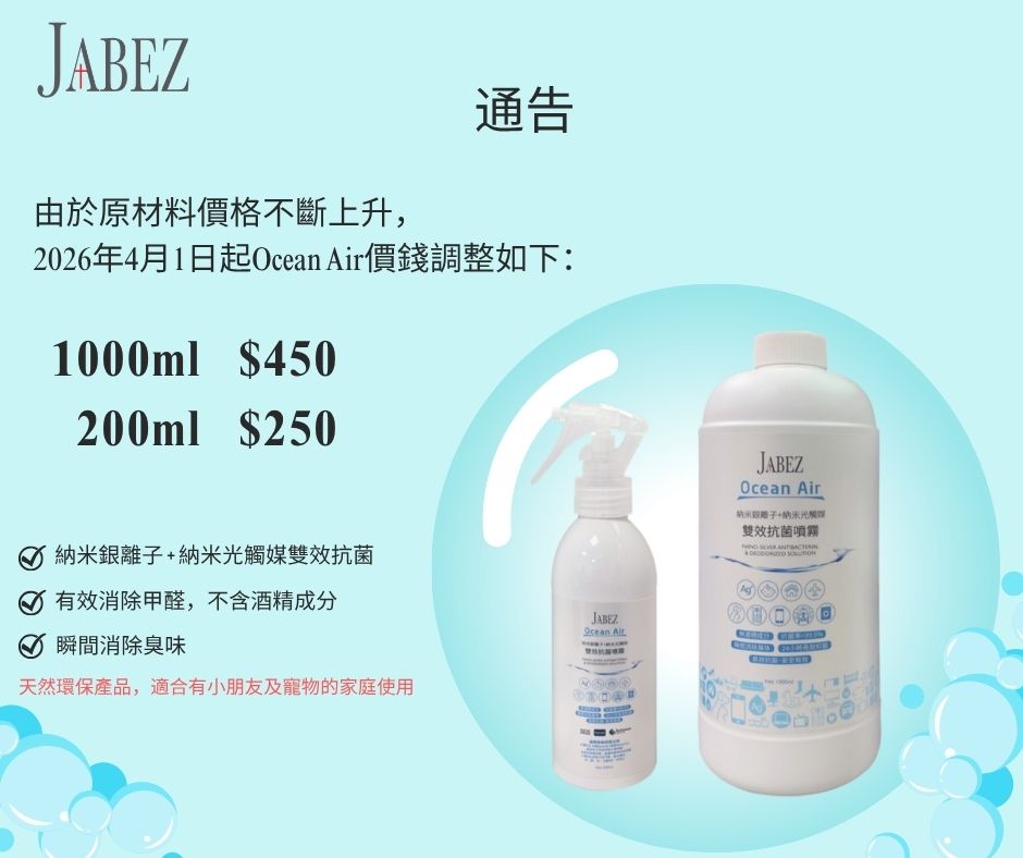 由於營運成本(原材料的銀及生產成本)上升本公司於2026年4月1日起調整價格。 三效合一納米銀離子及納米光觸媒的好處: JABEZ獨家抗菌技術 ✔️ 99.9% 高效抑菌 ✔️ 納米光觸媒 除甲醛、異味 ✔️ 瞬間除臭 淨化空氣 ✔️ 無毒無害 使用更安心 ✔️ 24小時長效防護 ✔️ 適用居家各種環境 ✔️ 無酒精成分 不傷皮膚 ✔️ 適用於各年齡層 ✔️ 多項抗菌檢測 有國際認證